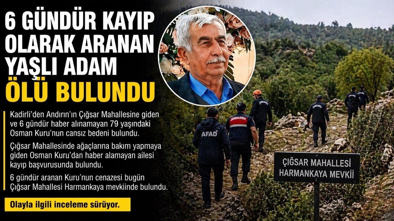 Osmaniye’nin Kadirli ilçesinden, Kahramanmaraş’ın Andırın ilçesine bağlı Çığşar Mahallesi’ne giden ve altı gündür kendisinden haber alınamayan 79 yaşındaki Osman Kuru’nun cansız bedeni bulundu.